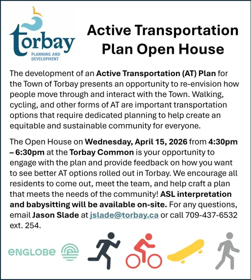 The Open House on Wednesday, April 15, 2026 from 4:30 p.m. - 6:30 p.m. at the Torbay Common is your opportunity to engage with the plan and provide feedback on how you want to see better AT options rolled out in Torbay. We encourage all residents to come out, meet the team, and help craft a plan that meets the needs of the community! For any questions, email Jason Slade at jslade@torbay.ca or call (709) 437-6532 ext. 254.