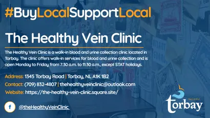 The Healthy Vein Clinic is a walk-in blood and urine collection clinic located in Torbay. The clinic offers walk-in services for blood and urine collection and is open Monday to Friday from 7:30 a.m. to 11:30 a.m., except STAT holidays.