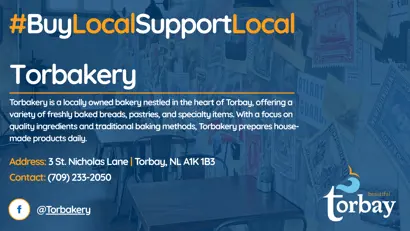 Contact information for Torbakery can be found in the graphic. The Town of Torbay encourages residents and visitors alike to visit our business directory on our Business Directory page.